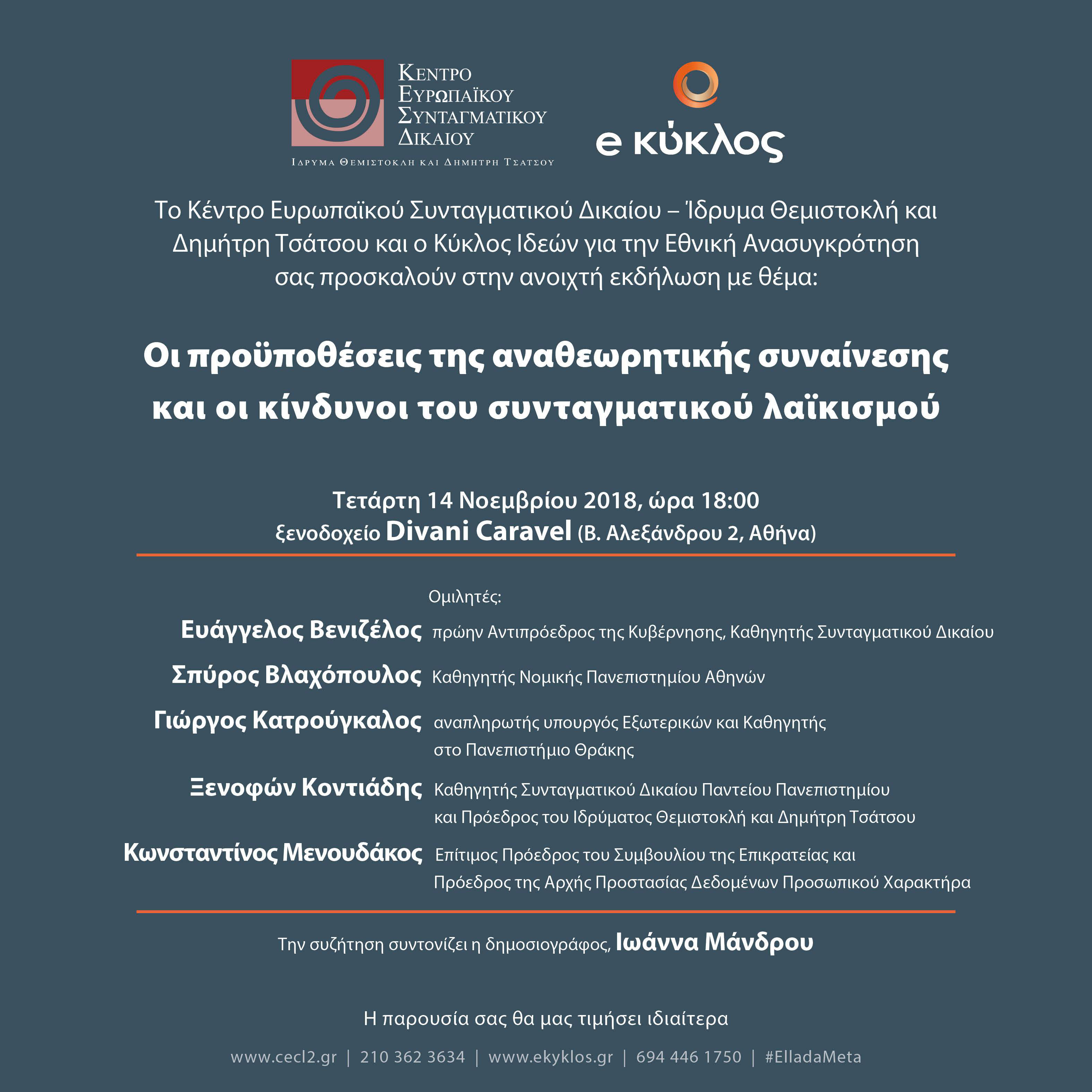 Το Κέντρο Ευρωπαϊκού Συνταγματικού Δικαίου – Ίδρυμα Θεμιστοκλή και Δημήτρη Τσάτσου και ο Κύκλος Ιδεών για την Εθνική Ανασυγκρότηση διοργάνωσαν ανοικτή εκδήλωση με θέμα:
